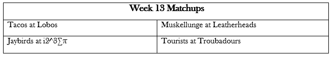 In Week 13, the i2^3∑π face the Jaybirds in a must-win game, while the Tourists look to gain ground on San Antonio as they take on the Troubadours in The Flats.