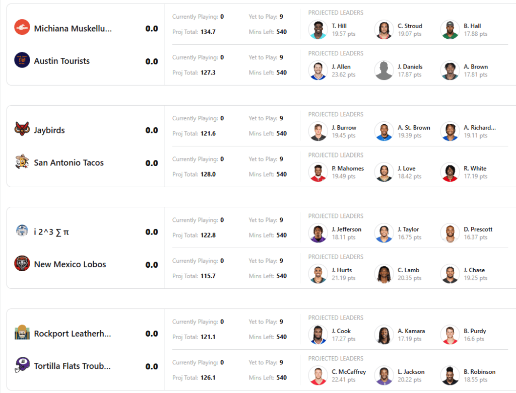 The Tortilla Flats Troubadours kicked things off with a savvy pick, selecting RB Bijan Robinson. The Rockport Leatherheads, opting to bolster their receiving corps, drafted DK Metcalf. The i2^3∑π, aka the “Robots,” picked up RB Jonathan Taylor, followed by the Jaybirds selecting RB Saquon Barkley. The San Antonio Tacos added RB Kyren Williams, while the Austin Tourists chose veteran RB Derrick Henry. WR Ja’Marr Chase was a steal for the New Mexico Lobos, and the Michiana Muskellunge shut the door on round three by selecting RB Jahmyr Gibbs.