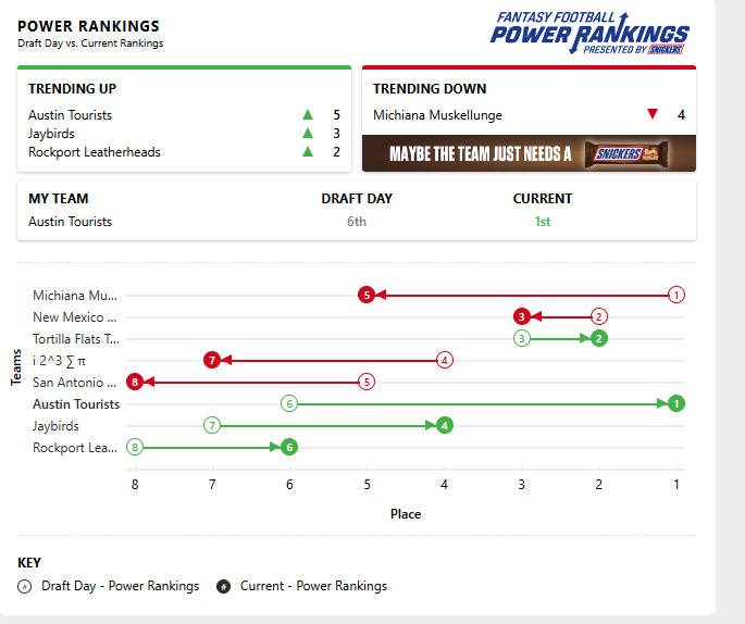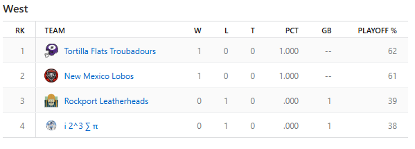 After Week 1, the New Mexico Lobos fell from No. 2 to No. 3, while the Tortilla Flats Troubadours moved up to No. 2. The biggest surprise came from the Austin Tourists, who skyrocketed from a preseason No. 6 ranking to claim the top spot at No. 1 after their impressive Week 1 victory.