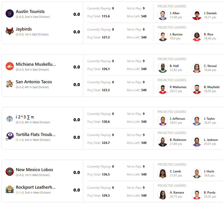 The Robots had some life in WR Justin Jefferson (23 points) and RB Jonathan Taylor (15 points), but the Leatherheads were simply unstoppable, even after losing QB Tua Tagovailoa to injury. Rockport’s James Cook (28 points) and Nico Collins (19 points) were major contributors in the rout. Now 1-1, Rockport is riding high into their Week 3 bout with the undefeated Lobos, while i2^3∑π will look to recalibrate as they head to Tortilla Flats to face the Troubadours.