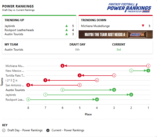 For the Muskellunge, it was a valiant effort, with standout days from Davante Adams (26 points) and Breece Hall (24 points), but they just couldn’t keep pace with the relentless Jaybirds offense. The Muskies remain winless as they prepare to face the desperate Tacos, while the Jaybirds have their eyes on the prize in next week’s top-tier battle against the Austin Tourists.