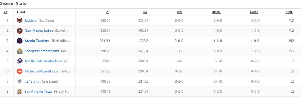 3. Austin Tourists (2-0) – The Tourists fall from the top spot but remain unbeaten and dangerous as they face the Jaybirds next.