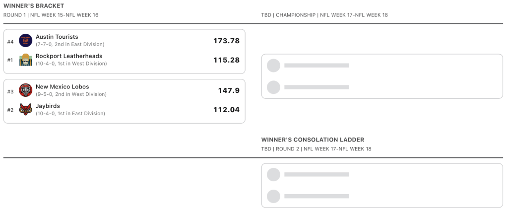 Kevin: As we head into Week 16, it’s do-or-die time. Will Austin and New Mexico hold on? Can the Leatherheads and Jaybirds rally back? And who’ll take home the Consolation Ladder bragging rights? We’ll find out soon enough.