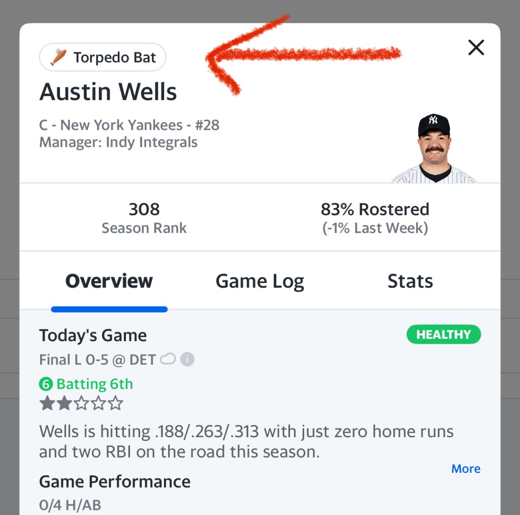 And now, because of course they are, Yahoo Fantasy Baseball is tagging which players are swinging torpedo bats—complete with an adorable little icon next to their name in the app. It’s a little ridiculous, but maybe kind of useful? Or maybe not. But in a game where every edge is tracked, parsed, and squeezed for value, why wouldn’t we flag who’s swinging the bat equivalent of a sci-fi prop? So if one of your guys shows up with the torpedo tag next week, maybe it’s nothing. Or maybe he’s about to hit five bombs and ruin someone’s week .