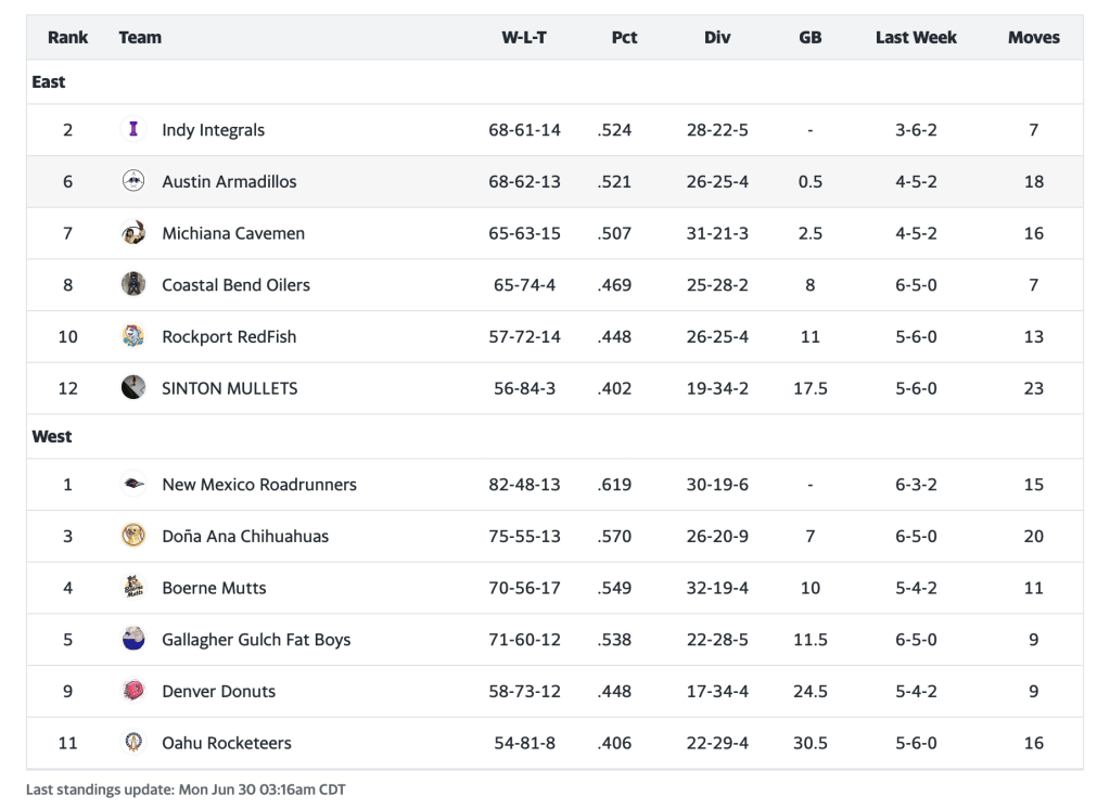 New Mexico’s balanced attack proved too much for the East’s top seed. The Roadrunners took four of six pitching categories and edged out the Integrals in average and steals. Both clubs are in top-six showdowns this week: No. 1 New Mexico looks to keep rolling against No. 6 Austin, while No. 2 Indy hosts the third-place Chihuahuas.