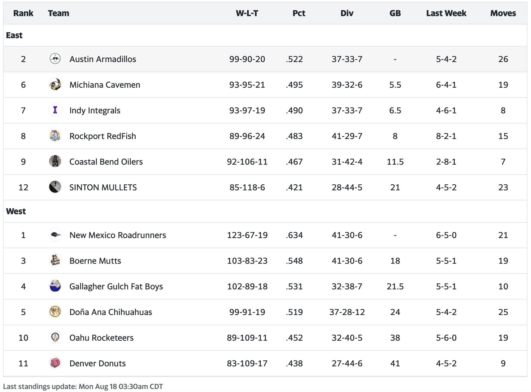 Back in Texas, the Austin Armadillos slipped past the Sinton Mullets 5–4 in a nail biter. The Armadillos’ bats exploded for 13 homers, 36 RBI, and a .317 average, which proved just enough to fend off Sinton’s strong pitching ratios and three saves.