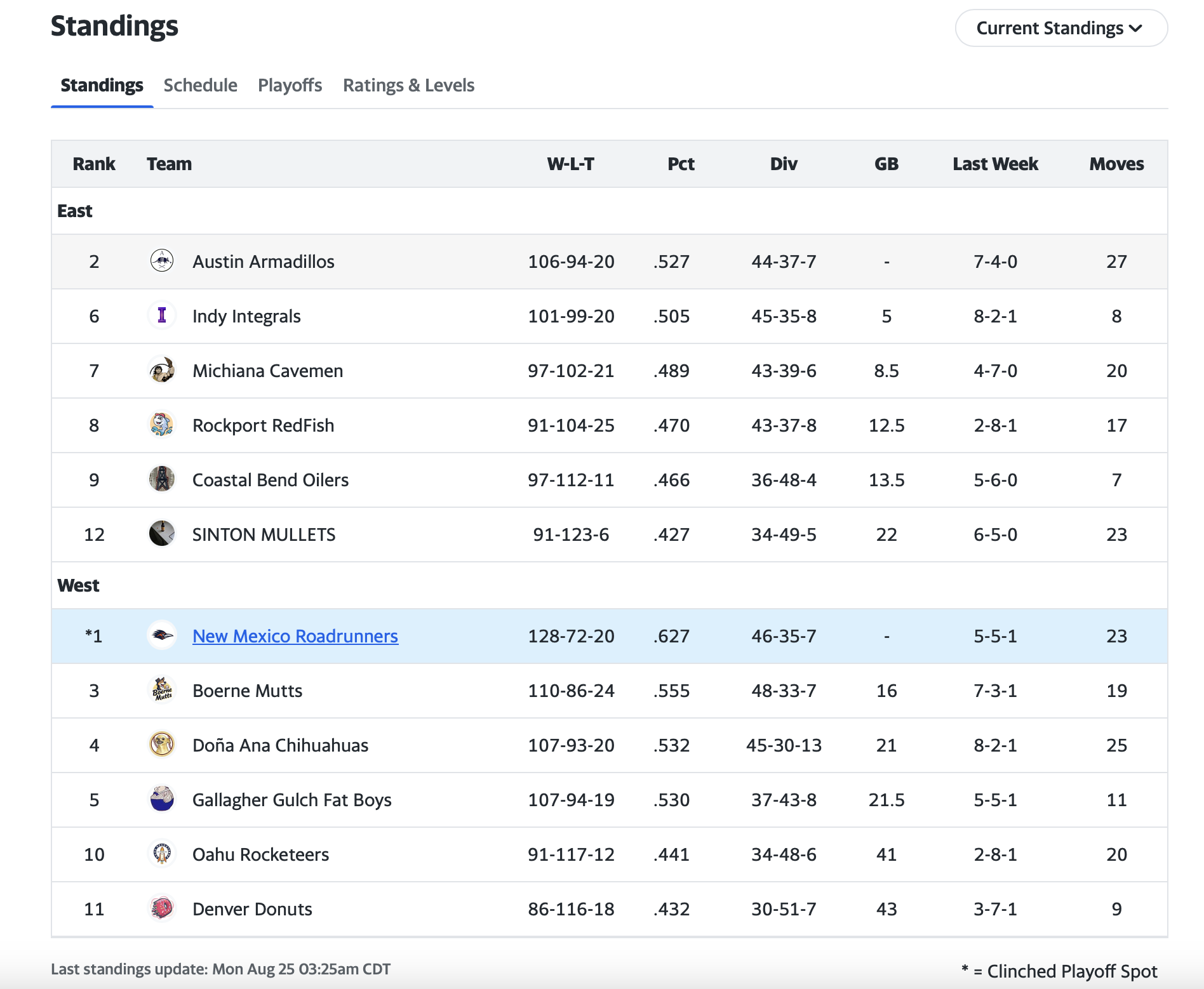 With two weeks left to play in the regular season, the New Mexico Roadrunners became the first PCI team to clinch a playoff spot. Their 5–5 tie with the Gallagher Gulch Fat Boys wasn’t flashy, but with roughly 80 years of fantasy baseball experience between those two owners, it felt fitting that neither could budge the other. The result was enough to lock in a berth and keep New Mexico atop the league.