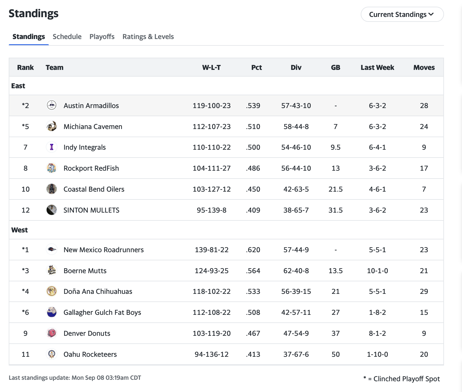 - Longest Winning Streak: Austin Armadillos, 8 straight (Weeks 15–22)