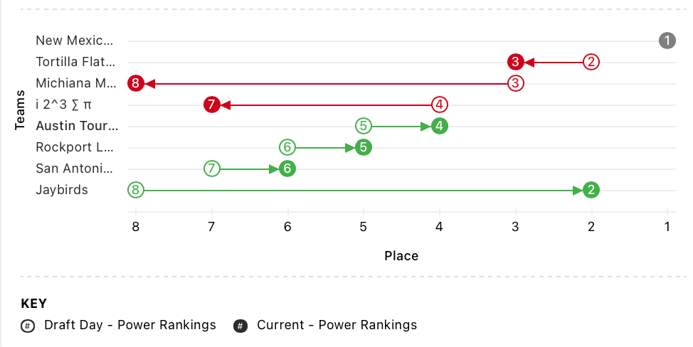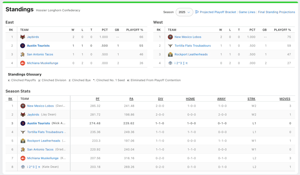 Rockport secured their first victory of 2025, knocking off i2^3∑π by a 130–81 margin. Ja’Marr Chase (36.5) and Patrick Mahomes (22.1) powered the way, while Bucky Irving (18.1) rounded out the scoring punch. The Robots got 19.9 from Baker Mayfield and 18.7 from Chuba Hubbard, but they slid to 0–2.