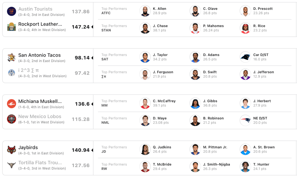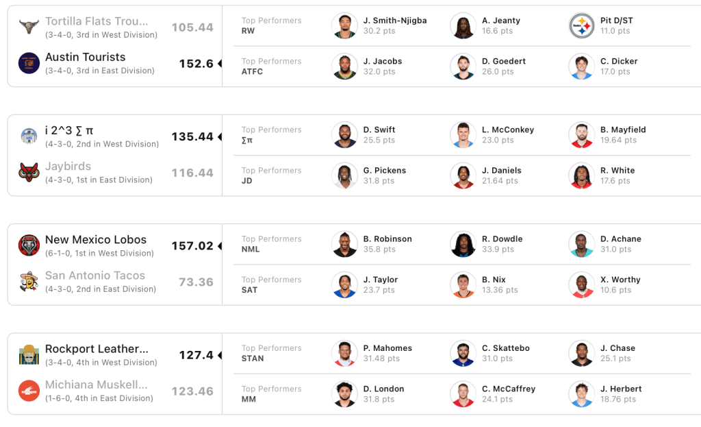 To be honest, the recaps I’ve been phoning in this year have been so generic they probably belong on the Great Value shelf at Walmart. No flash, no humor… just straight scores and stats. And let me tell you something about taking last week’s scores and rearranging them into something that vaguely resembles a weekly league recap: it’s boring as hell. I’ve always loved creative writing—with the emphasis on creative.
