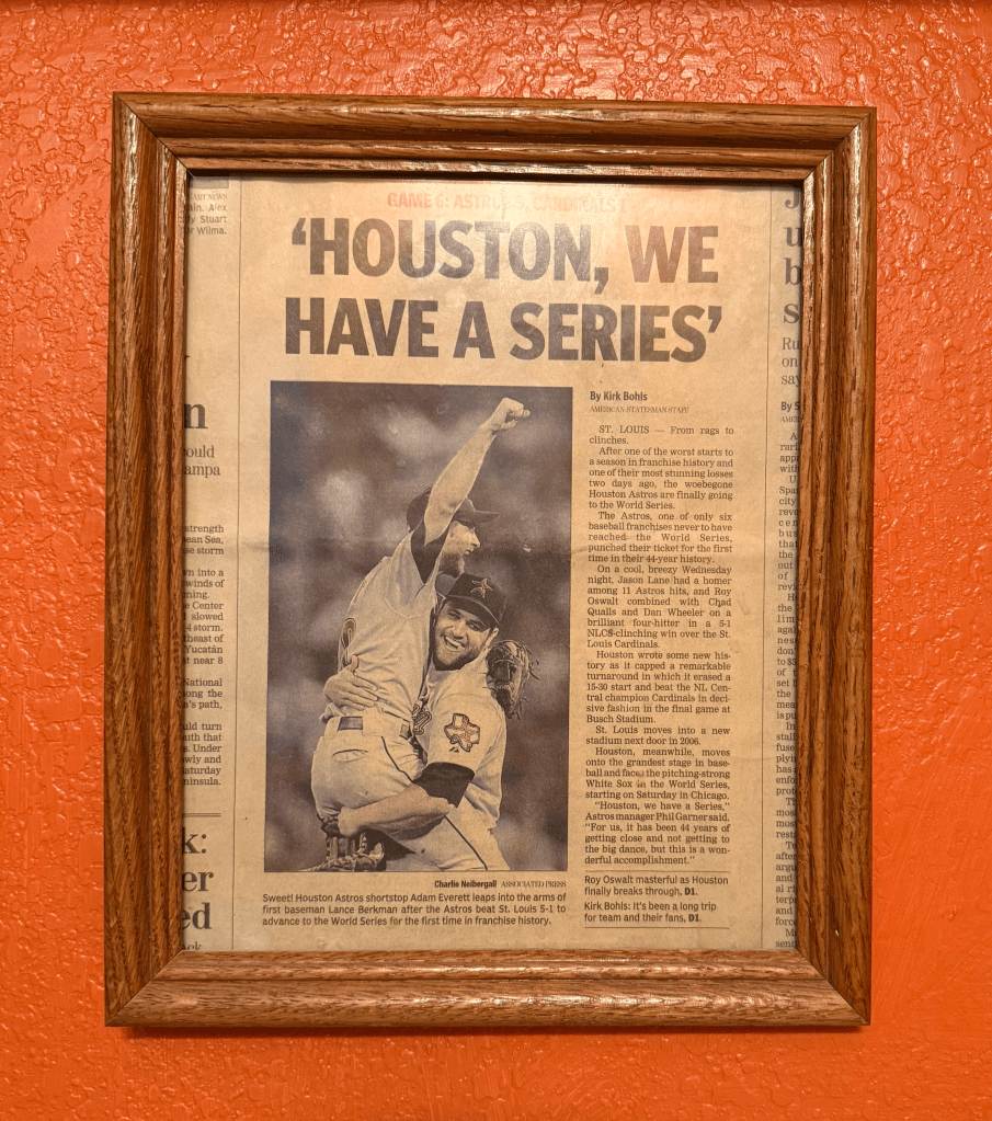 Also, I’ve been waiting for a chance to use the word woebegone in… anything, since about 2005. I’m fairly certain I’ve never even said it out loud, let alone written it, but I’ve read it more times than I can count—basically every time I use the spare bathroom in our house. Right there, above the toilet, is a framed sports page from the Austin American-Statesman after the Astros beat the Cardinals to advance to their first World Series. Staff writer Kirk Bohls, under the predictable yet charming headline “Houston, We Have a Series,” wrote: