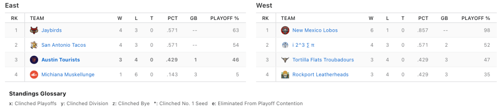 Speaking of football, it’s not like I didn’t have plenty of HLC action to write about the past two weeks. We could have talked about the Jay Birds and the Tacos battling for first atop the East. Or the overall aggressively average quality of the league this year: lots of 3-4s and 4-3s. And of course, we could have talked about the one team that dared rise above all that mediocrity: the Lobos, who just kept winning… until suddenly they weren’t.