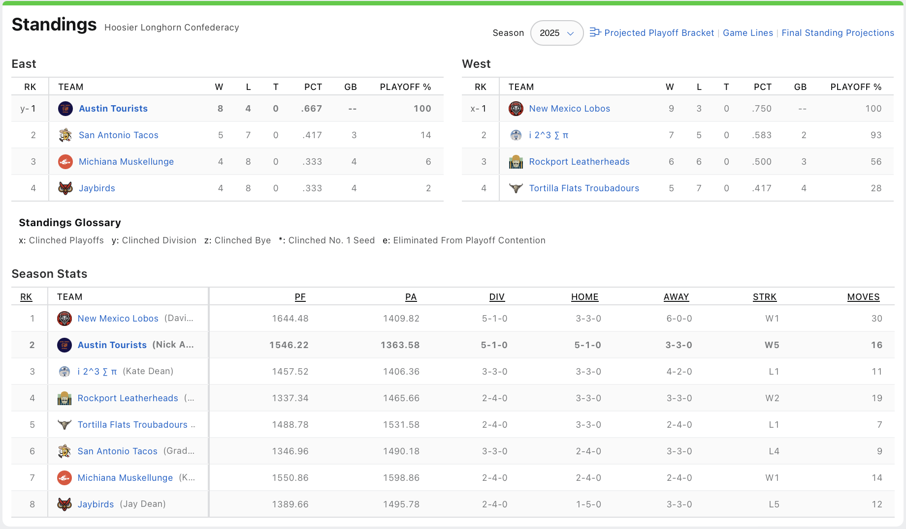 In the East, the Tourists stand alone at the top, but the rest of the division remains crowded. The San Antonio Tacos (5–7) are still in the mix as they prepare to face the Lobos, while the Jaybirds sit at 4–8 and will need several things to break their way over the next two weeks. The Troubadours (5–7), though in the West, are in a similar spot–this week’s matchup against the Tourists is essential to keeping their playoff scenario intact.