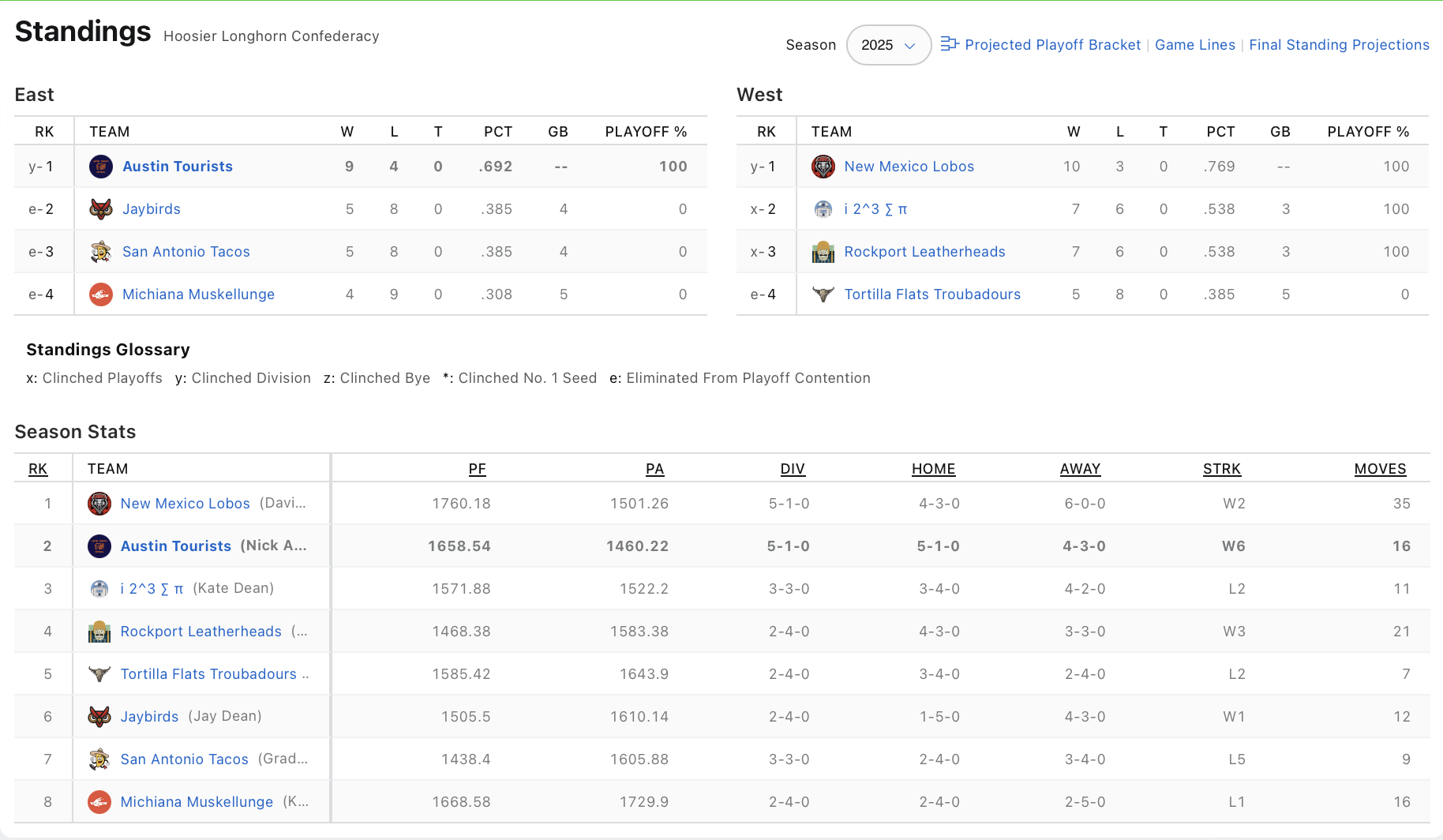Week 13 is in the books, and with just one week left in the HLC regular season, the playoff field is officially locked. The Austin Tourists improved to 9–4 with a win over Tortilla Flats. They secured the East last week and now carry a six-game win streak into the regular-season finale as the division’s lone playoff representative. In the West, the New Mexico Lobos clinched the division and moved to 10–3 after beating the Tacos, holding steady as the projected No. 1 seed.