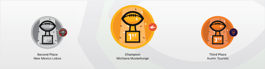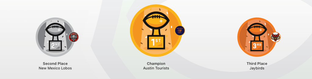 In the championship game, the Tourists faced the New Mexico Lobos, who were making their third straight appearance in the title game. Despite losing Josh Allen before the game, Austin rose to the occasion behind a career-defining performance from Derrick Henry, who bulldozed his way to 54 points. Courtland Sutton added 37 points, and Baltimore’s defense stepped up with 31 points to seal the deal. The Lobos, missing Jalen Hurts and CeeDee Lamb, fought valiantly behind Justin Herbert, Trey McBride, and Ja’Marr Chase, but ultimately fell short. Austin secured the championship with a final score of 286-267.
